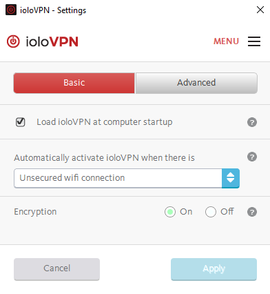You can view your ioloVPN settings by right-clicking on the ioloVPN icon in your system tray, and then selecting Settings. The Basic settings screen appears.